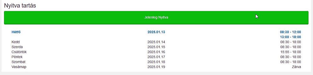 A beállított adatok szerint megmutatja a nyitva tartási időnket. Sok beállítási lehetőséggel
